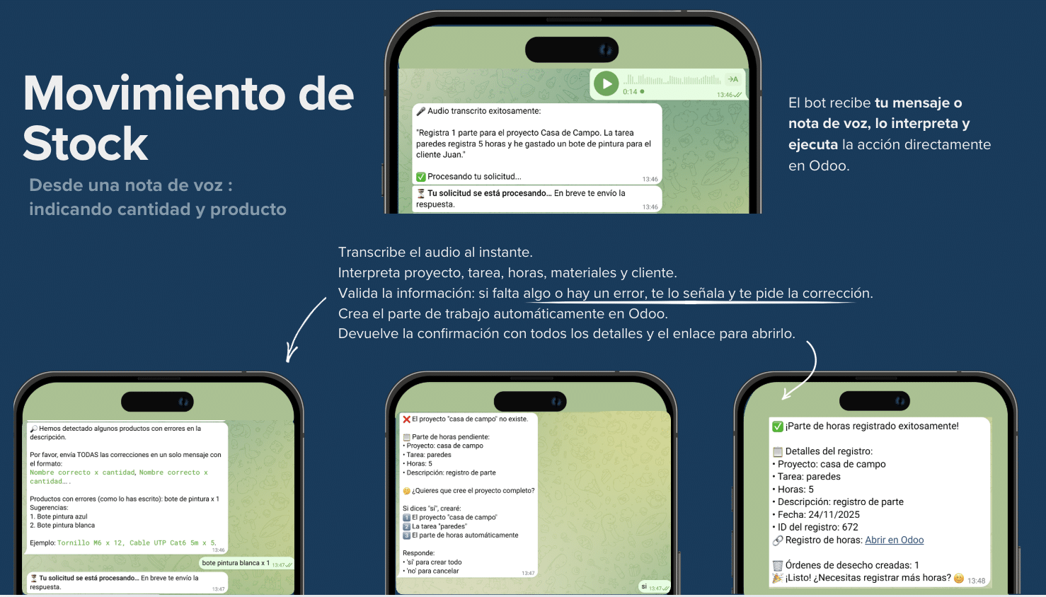 - Registra el parte automáticamente en Odoo.